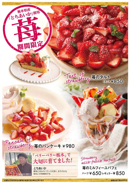- 本フェアでは全てのスイーツにフレッシュな苺をトッピングしており、期間やエリアによって、「とちあいか」、「京の雫おいCベリー」、「やよいひめ」を使用し、旬の美味しい品種の苺をお楽しみいただけます。