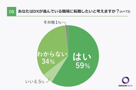 「Q8.あなたはDXが進んでいる職場に転職したいと考えますか?」という問いに対して、「はい」という回答が59%、ついで「わからない」という回答が34%という結果になりました。全体として6割弱の方がDXの進んでいる職場を望んでいることがわかりました。