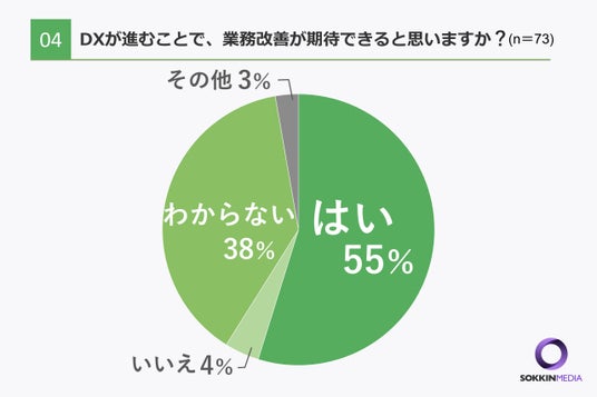 「Q4.デジタルトランスフォーメーション(DX)が進むことで、業務改善が期待できると思いますか?」という問いに対して「はい」と回答した方が最も多く55%、また「わからない」という回答が33%という結果になりました。認知していない方もまだ4割近くいらっしゃるため、認知度の促進が求められます。