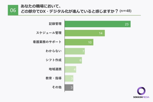 「Q6. あなたの職場において、どの部分でDX・デジタル化が進んでいると感じますか?」という問いに対して、「記録管理」に23人の方が回答をし、ついで「スケジュール管理」に14人の方が回答するという結果になりました。電子カルテやタブレットを活用しDXを進めています。