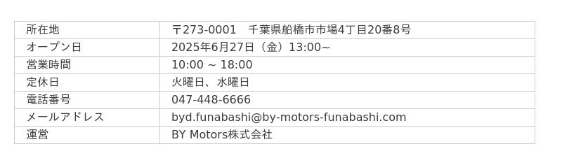 BYDの日本法人であるBYD Auto Japan株式会社(本社:神奈川県横浜市、代表取締役社長:東福寺 厚樹、略称:BAJ)の正規ディーラーであるBY Motors株式会社(本社:千葉県船橋市、代表取締役社長:相川昌光)は、2025年6月27日(金)13時にショールームを備えた正規ディーラー店舗「BYD AUTO 船橋」をオープンします。本店舗は全国で42店舗目、そして千葉県では初となるBYD正規ディーラー店舗です。