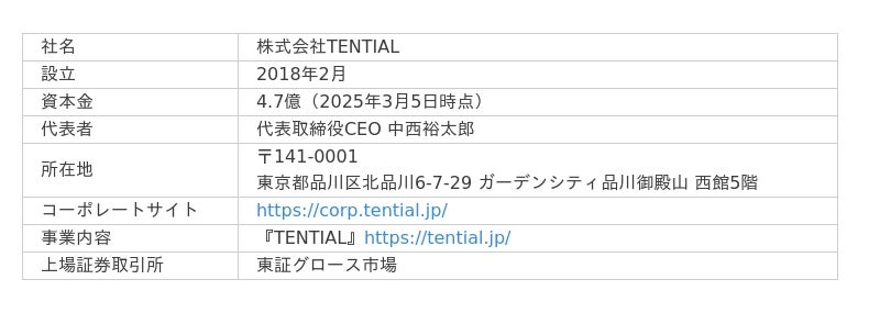 株式会社TENTIALは、「健康に前向きな社会を創り、人類のポテンシャルを引き出す。」をミッションに掲げ、コンディショニングブランド『TENTIAL』を運営しています 。代表取締役CEO中西裕太郎は、プロサッカー選手を目指した高校時代に病気で夢を絶たれた原体験から、自身のポテンシャルを最大限に発揮するためには健康と日々のコンディショニングが不可欠であると痛感 。この経験から株式会社TENTIALを創業し、世の中に「コンディショニングを実装する」ことを目指しています。コンディショニングブランド『TENTIAL』は、アスリートの知見と最新技術・研究に基づき、機能性を追求した製品・サービスを提供。24時間365日、日常生活のあらゆるシーンで心身を整え、疲労回復やパフォーマンス向上をサポートするコンディショニング活動を推進しています 。すべては個人のコンディションとポテンシャルを引き出すという信念のもと、株式会社TENTIALは、健康に前向きな社会の実現のため、コンディショニングの社会実装に取り組んでまいります