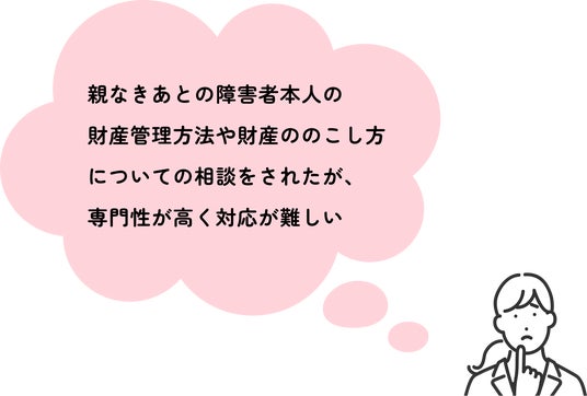 「法律」「お金」「相続」など、専門的な話題に及ぶ、相談者ご家族の「親なきあと問題」に関するお悩みやご不安に対して、適切な回答をすることが難しい、と感じられている相談支援機関の管理者や相談員の方も多いです。