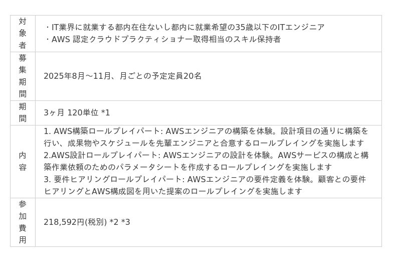 *3 トレーニングの受講に必要なPCや通信回線などの設備、環境構築や検証を行うAWS利用費は受講生負担となります