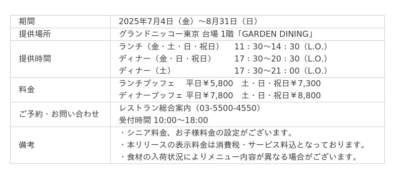 「東京を楽しむ 東京をくつろぐ」ひとときをお届けするグランドニッコー東京 台場(住所:東京都港区 代表取締役社長 総支配人:塚田 忠保)は、緑と光が溢れる開放的なブッフェレストラン「GARDEN DINING」にて、2025年7月4日(金)~8月31日(日)の期間中にお台場でハワイ気分が楽しめると毎年好評の「ハワイフェア」を開催いたします。