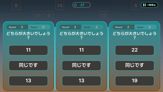 どちらの数値(値)が大きいでしょうか?数字や簡単な数式を比較し、より大きな方を選択することで、実行機能向上を目指すコンテンツです。