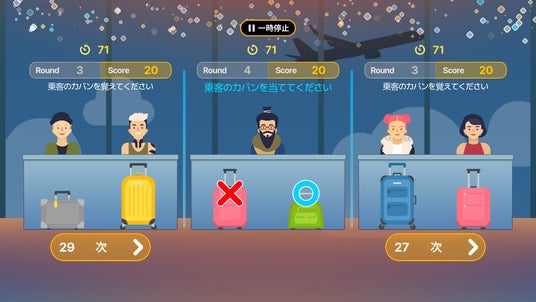 空港職員になってお客様のカバンをお預かりください。カバンの特徴や持ち主の身体的特徴を関連付けて覚え、記憶力や注意力、集中力の向上を目指すトレーニングです。