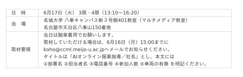 株式会社NTT ExCパートナー(エヌ・ティ・ティ エクシーパートナー 本社:東京都千代田区、代表取締役社長:矢野 信二)と学校法人 名城大学(名古屋市天白区、学長:野口光宣)薬学部の牛田誠准教授は、共同で「AIオンライン服薬指導学習システム」を開発しました。6月17日(火)の授業から新システムを用いた学習を始め、その様子を報道機関向けに公開※します。