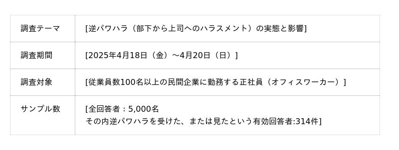 本調査は、2025年4月18日~20日にわたり、株式会社ジェイフィールによって実施されました。対象は従業員数100名以上の企業に勤務する課長職を中心とした正社員で、全回答者:5,000名。その内逆パワハラを受けた、または見たという有効回答者:314件のデータをインターネット調査により収集しました。