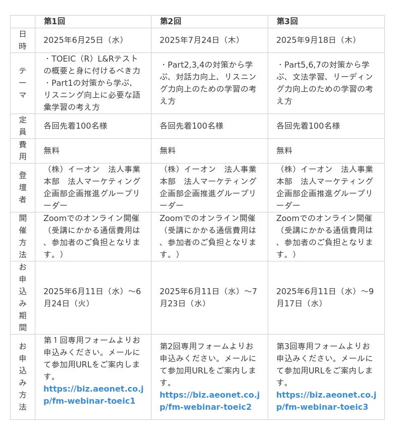 英会話教室を運営する株式会社イーオン(本社:東京都新宿区、代表取締役社長:重野卓、以下「イーオン」)は、2025年6月25日(水)を第1回として、「TOEIC(R)L&Rテスト」のスコアアップが課題の企業人事ご担当者向けに無料オンラインセミナー全3回を開催します。