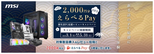 この度、エムエスアイコンピュータージャパン株式会社は、2025年03月01日(土)から2025年05月31日(金土)までの間、対象のZ890/B860/X870/B850チップセットを搭載したマザーボード又は一部のMSI簡易水冷クーラーや電源ユニット、PCケースを購入後、正規販売店ECサイトもしくは価格.comなどの指定サイトにレビューを投稿いただいた方全員に、最大2,000円分のえらべるPayをプレゼントする冬こそ自作PCレビューキャンペーンを実施いたします。