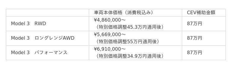 テスラは、より多くの方にテスラの魅力をご理解いただき、持続可能なエネルギーへの移行を加速させることを目指しています。このたび、Model 3の在庫車を6月30日までのご注文で、最大55万円(Model 3 RWD:45.3万円、Model 3 ロングレンジ:55万円、Model 3 パフォーマンス:34.9万円)特別価格調整を実施し、これまでよりもお求めやすい価格でご購入いただけるようになりました。令和7年度のCEV補助金と今回の特別価格調整を活用することで、Model 3はこれまで以上に価格競争力に優れた一台となり、より多くのお客様にとって魅力的な選択肢となります。