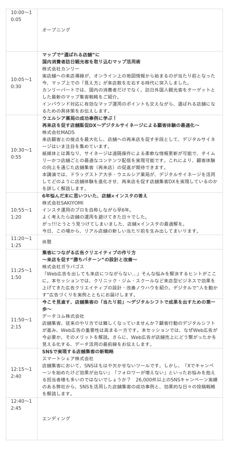 本カンファレンスでは、多くの店舗支援実績を持つ事業会社の専門家たちが登壇。現場で実際に成果を上げた具体的な施策や、デジタルツールの導入・活用方法について、実践的な視点から解説します。