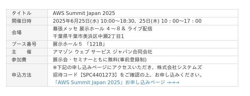 ITリノベーションとマイグレーションを事業展開する株式会社システムズ(所在地:東京都品川区、代表取締役社長:小河原 隆史)は、2025年6月25日(水)・26日(木)の2日間、幕張メッセで開催される日本最大の”AWSを学ぶイベント”「AWS Summit Japan 2025」に出展します。