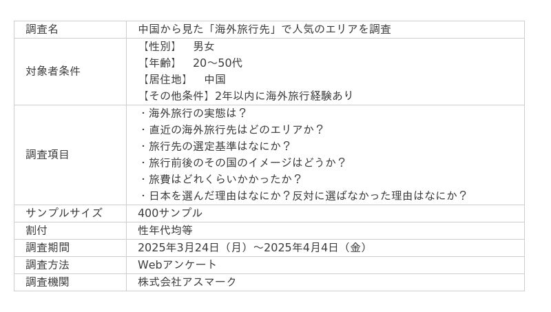 調査項目は、海外旅行の実態、直近の海外旅行先のエリア、旅行先の選定基準、旅行前後のその国のイメージなどについて聴取しています。