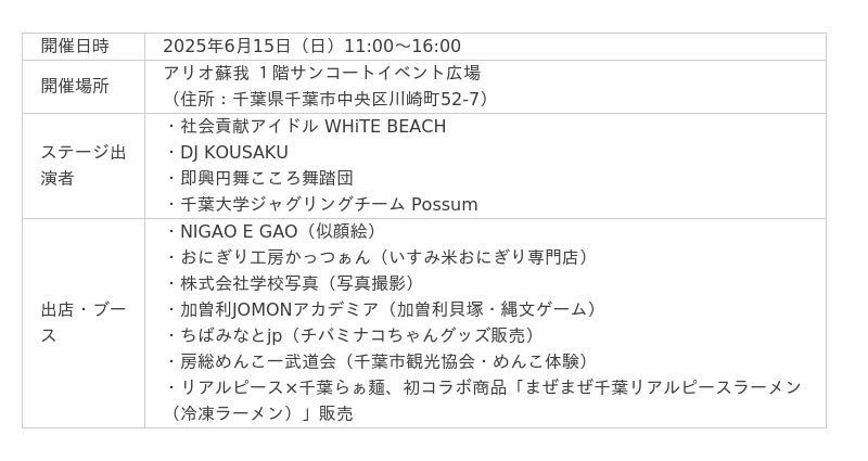 同日アリオ蘇我1階サンコートイベント広場では、千葉の地域活性化を目的とし、千葉の人、モノ、食の出会いを創出する「千葉ハレノヒ万博」も開催いたします。
