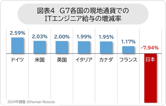 ITエンジニアの給与および増減率をG7構成国で比較すると、USドルベースの平均年収において、日本はG7で最下位でした。また、前年比の増減率においても、英国4.16%増、ドイツ2.59%増など、G7各国が増加している一方、日本は-16.70%の減少と、G7で唯一減少しています。対USドルの為替変動の影響を考慮し、各国の現地通貨ベースで比較しても、G7各国ではITエンジニアの給与が上昇している一方、日本は円ベースでも、前年より減少している結果となりました。
