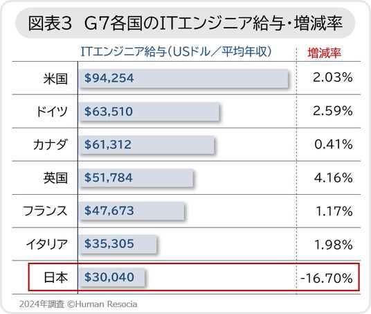 ●日本はITエンジニア給与で31位、前年比の増減率では59位で、いずれもG7構成国で最下位となり、グローバルなITエンジニア獲得競争で後れをとることが懸念される