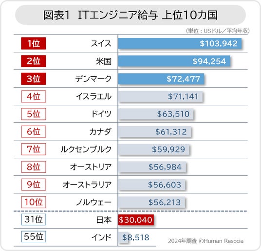 ●世界73カ国のITエンジニアの給与、USドルベースでは1位スイス、2位米国、3位デンマーク