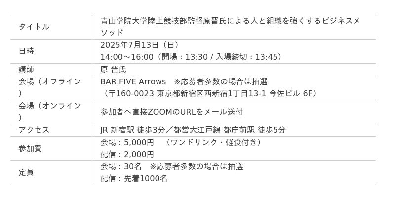 青山学院大学陸上競技部監督原晋氏による 人と組織を強くするビジネスメソッド 特別セミナーを7月13日(日)BAR FIVE Arrows@西新宿とオンライン@ZOOMでハイブリッド開催!