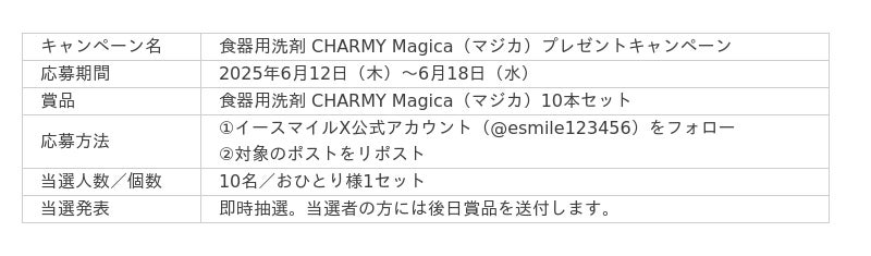 食器用洗剤(CHARMY Magica)10本セットプレゼント!Xでフォロー&リポストキャンペーンを開催!応募画面ですぐに抽選結果が分かる♪