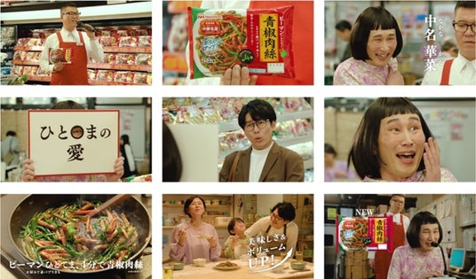 た。青椒肉絲をテーマにした今回のCMでは、中名 華菜が「ひと〇ま」という穴あきフリップを手に、お得意のクイズ形式で『中華名菜』の本質に迫ります。一瞬ざわつくようなワード選びと、そこに込められた「手間=愛」というメッセージ。共演の長谷川忍さん演じるハセガワ店員とのやりとりを通して、中名 華菜ワールド全開の “劇場型”ストーリーが展開されます。
