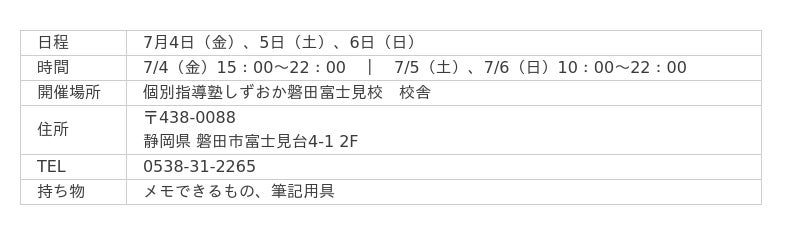 オンラインで東大生などの個別指導が受けられる個別指導塾s-Liveしずおか磐田富士見校。開校前説明会は7月4日(金)~ 7月6日(日)の3日間開催。