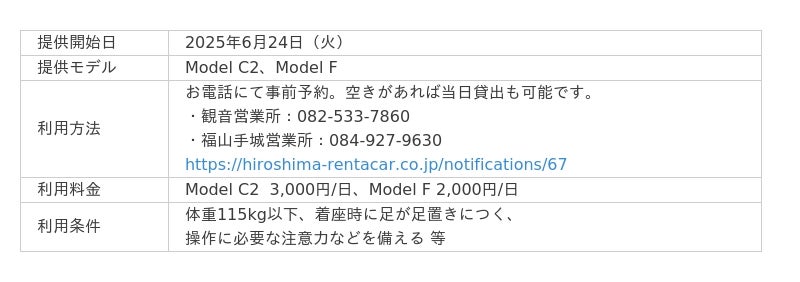 主にタクシー事業を展開するつばめ交通株式会社(本社:広島市、代表取締役:山内恭輔、以下「つばめ交通」)と広島レンタカー株式会社(本社:広島市、代表取締役:奥原賢次郎、以下「広島レンタカー」)は、業界の横断連携を通じて観光や日常における二次交通課題の網羅的な解決を目指し、WHILL株式会社(本社:東京都品川区、代表取締役社長 CEO:杉江理、以下「WHILL社」)が開発する、免許不要で歩行領域を走行する近距離モビリティWHILL(ウィル)を活用した移動サービスを開始することを発表いたします。高齢化や旺盛なインバウンド需要などに伴う多様化が進む中、車の乗り入れが難しい目的地でも、旅行者や地域住民など誰にとっても安心快適に過ごしやすい移動環境を整える狙いです。タクシーおよびレンタカー業界における同サービスの提供は中国地方初です。