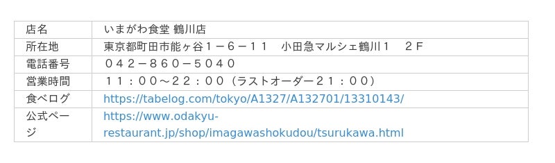 『いまがわ食堂 鶴川店』店舗URL:https://www.odakyu-restaurant.jp/shop/imagawashokudou/tsurukawa.html