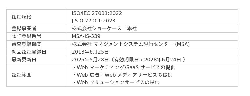 企業と顧客をつなぐDXクラウドサービスを展開する株式会社ショーケース(東京都港区、代表取締役社長:平野井順一、証券コード:3909、以下ショーケース)は、セキュリティ管理体制のさらなる強化を目的として、これまで取得していた情報セキュリティマネジメントシステム(ISMS)の認証を、最新規格である「ISO/IEC 27001:2022 / JIS Q 27001:2023」へ更新いたしました。併せて、クラウドサービスに関する情報セキュリティの国際規格「ISO/IEC 27017:2015」についても、認証の更新を完了したことをご報告いたします。これにより、第三者機関の厳密な審査を経て、当社の情報セキュリティ体制が最新の国際規格に準拠していることが証明されました。
