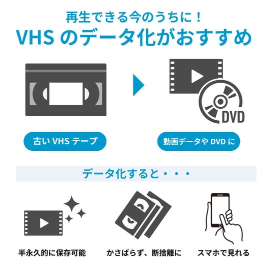 一般家庭においても、「ビデオデッキを処分してしまい家にあるVHSが再生できない」「VHSのデータをパソコンやスマホで見たい」とお悩みの方は多いのではないでしょうか。