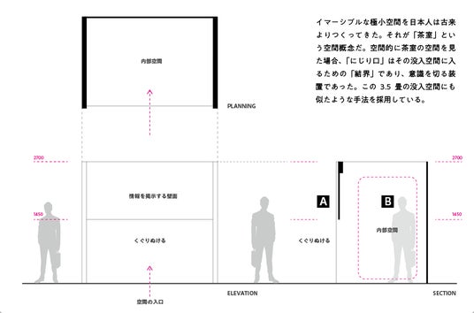 3.5 畳という極小空間に没入空間をつくる。限られた空間の中でどのように外界から切り離された没入空間をつくるか。そこには、かつて日本人が歴史的な空間構築の流れの中で築き上げてきた「結界」という概念を用いる。結界という概念は多分に人間の「意識」と関係している。内部の空間に進むために、「頭を下げて」くぐり抜ける、という行為。これは線一本、小石1 個でも構わない。「意識」を切ることで、外界から内部への気持ちの切り替えをする。没入空間はこのように、人間の意識・心理を積極的に関連付けることで、更に「深化」させることができる。そして、わずか3.5 畳の空間であっても、没入空間は作り上げることは可能だ。昨今、没入体験を伴う販促手法が増えてきた。この販促手法は、このような空間デザインの手法を活用することでまだまだ進化をする余地が残っていると感じる。つまり、今後も大きな可能性をもっている販促手法なのだ。「空間デザイン」とは何なのか。これまでのように専門家の間だけでなく、社会一般に広く「空間デザイン」の概念とその可能性について知ってもらいたい、と願う。