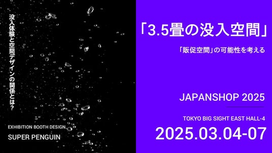 昨今、「没入空間」という販促手法が増えている。展示会のブースデザインを専門に行うSUPER PENGUIN株式会社(東京都品川区・代表取締役/展示会デザイナー竹村尚久)は、3月4日(火)~7日(金)まで、東京ビッグサイトで開催される日経メッセ/JAPANSHOPに出展し、「3.5畳の没入空間」を設置します。限られた小さな空間において、どのような没入空間の手法をとるのか。今回は日本の空間が古来より用いてきた「仕切」という考え方と「囲われている感」という2つのキーワードにより空間を構成し、イマーシブルスペース(没入空間)と「空間デザイン」の関係性についてお伝えをいたします。社会が誤解している「空間デザイン」という概念。最新テクノロジーを使わず、人間の「心理」を活かした空間構成の手法をお伝えいたします。