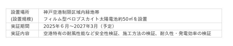 神戸空港制限区域内の緑地帯にフィルム型ペロブスカイト太陽電池を防草シート上に設置、空港特有の耐風性能など安全検証他、各種検証を行います。