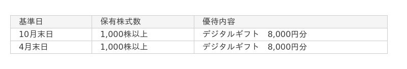 対象の株主様に対して、各8,000円分(年間合計16,000円)のデジタルギフトを進呈いたします。