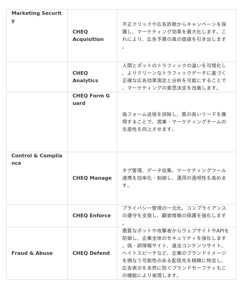 CHEQ が提供する具体的なソリューションは以下のとおりです。CHEQ は、マーケティング活動からセキュリティ、コンプライアンスまで、企業のデジタルプレゼンス全体を包括的に保護します。