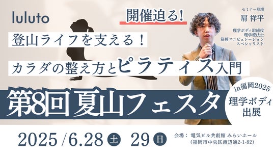 理学療法士の技術で世界中の人々を健康にすることを目指す株式会社理学ボディ(本社:東京都渋谷区、代表:木城拓也)は、2025年6月28日(土)・29日(日)に開催される「第8回 夏山フェスタin福岡」にて、登山後の膝や腰のケアに特化したピラティス体験ブースを出展いたします。