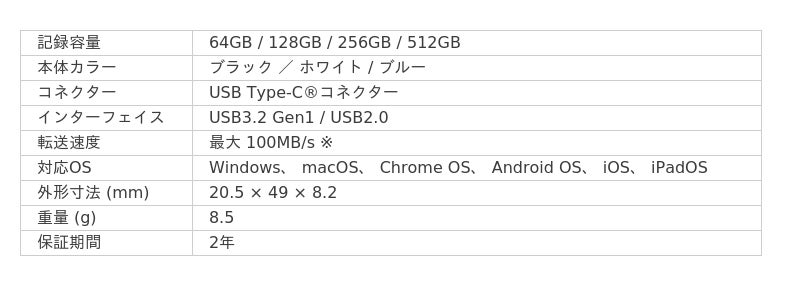 パソコンはもちろん、iPhoneやiPad、Androidスマートフォンなど、USB-C(R)ポート搭載デバイスに幅広く対応するUSBメモリーです。スマートフォンなどの容量不足を手軽に解消できます。