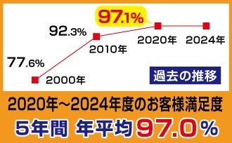 また、お客様満足度(当社調べ)は、5年間で年平均97.0%を記録し、高い評価を頂いております。