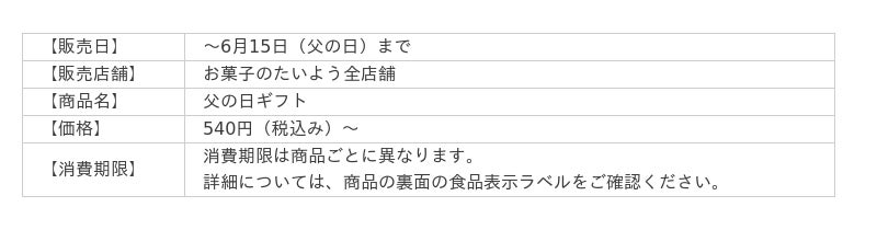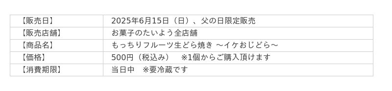 株式会社太陽社(所在地:千葉県匝瑳市飯倉293、代表取締役:片岡正裕)が展開する千葉県で長年愛される菓子店「お菓子のたいよう」は、2025年の父の日限定スイーツとして、「もっちりフルーツ生どら焼き──親父のような『イケおじどら』」をはじめとした、父の日限定ギフトを2025年6月15日(日)の1日限定で販売いたします。