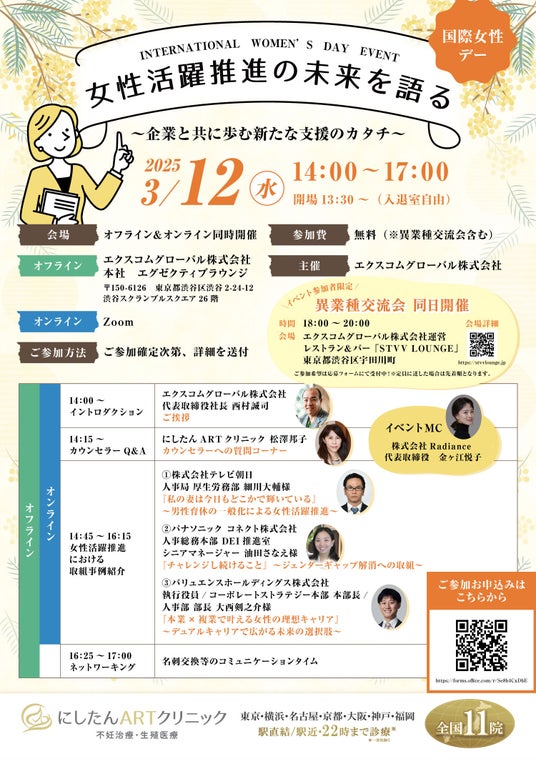 エクスコムグローバル株式会社(本社:東京都渋谷区渋谷2-24-12 渋谷スクランブルスクエア 26階、代表取締役社長:西村誠司)が運営を支援している不妊治療専門クリニック「にしたんARTクリニック」では現在、女性活躍に寄与できる福利厚生サービスを法人様向けに無償提供し、日本を今より女性が活躍できる国にすべく啓蒙活動を行っております。