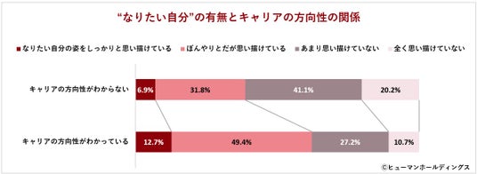 前述のQ2では、65.4%が自身のキャリアの方向性が明確になっていない状況が示されていますが、なりたい自分の姿を思い描けてていると、キャリアの方向性も明確になっている傾向が見られます。