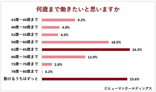 「何歳まで働きたいと思いますか」という質問には24.3%が「61歳~65歳」と回答し、最多の結果になりました。一般的に定年後の再雇用や継続雇用が始まる年齢であり、定年後も働く意向の人が多いようです。また、「動けるうちはずっと」(23.6%)と回答した人もほぼ同数であり、身体的に問題がなければ、働き続けたいと考える人が多数派のようです。