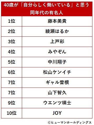 「自分らしく働いていると思う同年代の有名人」を聞くと(自由回答)、1番多くの票を集めたのは、「藤本美貴さん」でした。次いで、2位は「綾瀬はるかさん」、3位は「上戸彩さん」という結果になりました。