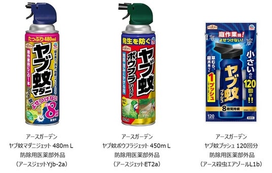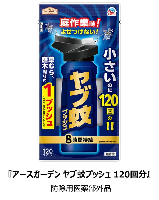 当社では、園芸用ヤブ蚊対策として、3製品をご用意しています。直接駆除や発生源を対策したいときは、ヤブ蚊・マダニを駆除する『アースガーデン ヤブ蚊マダニジェット 480mL』、ヤブ蚊・マダニに加え、ボウフラを駆除する『アースガーデン ヤブ蚊ボウフラジェット 450mL』がオススメです。手軽に広範囲で使用したいときには、噴射するだけでヤブ蚊を駆除し、約8時間よせつけない(※1)1プッシュ式スプレー『アースガーデン ヤブ蚊プッシュ 120回分』をオススメします。使用環境に合わせてご使用ください。