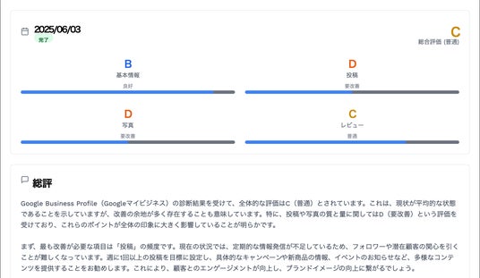 診断レポートでは、基本情報、投稿、写真、レビューの4項目で設定状況を評価します。