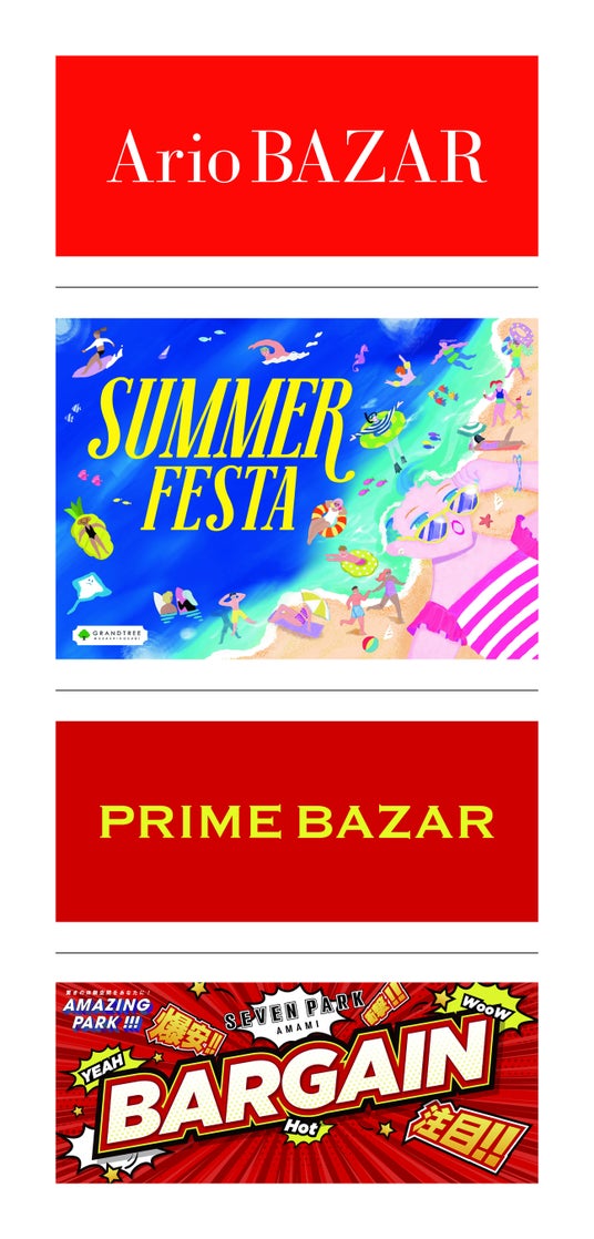 全国のアリオ18店舗で「Ario BAZAR」、グランツリー武蔵小杉「SUMMER FESTA」、プライムツリー赤池「PRIME BAZAR」、セブンパーク天美「SEVEN PARK AMAMI BARGAIN」を開催します。夏のファッションアイテムをはじめ、今ほしいものをご用意し、お客様にお得なお買物をお楽しみいただけます。