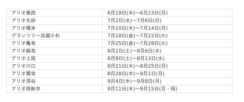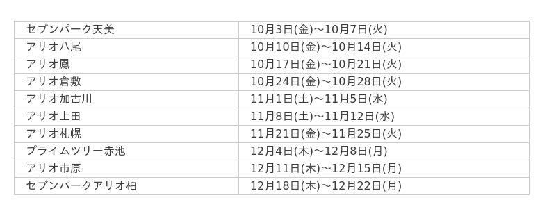 【実施店舗】:全国のアリオ18店舗・グランツリー武蔵小杉・プライムツリー赤池・セブンパーク天美