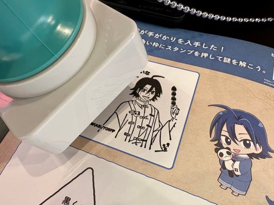 こちらには真波山岳のスタンプがあります。まずはキットにスタンプを押し、読み進めるとキャラクターたちが謎解きの手がかりについて会話していくので、一緒に謎を解いていきましょう。