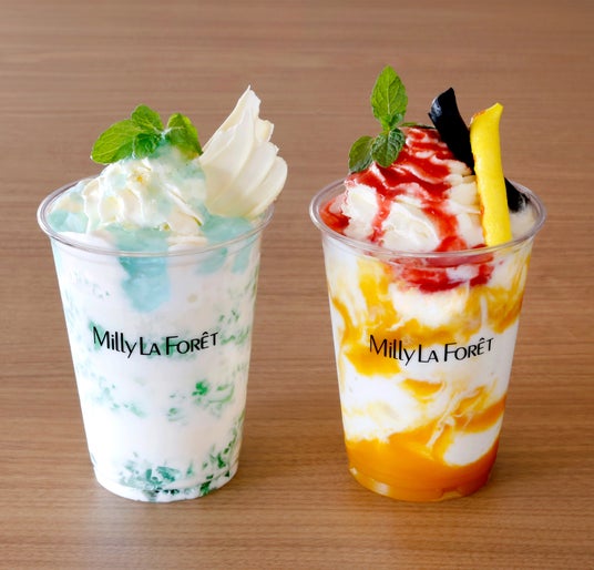 (左)全員がエース!ハコガクの弾けるパチパチシェイク ラムネ味 1,600円(税込)(右)繋ぐ絆!総北のマンゴーシェイク 1,600円(税込)